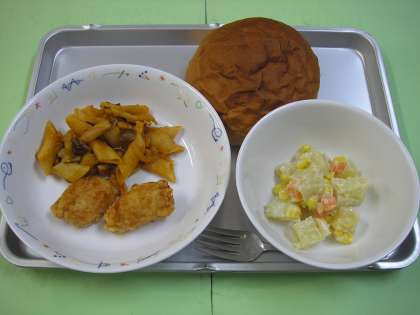 「ホットポテサラ」は、給食ならではのメニューかもしれません。給食では、生野菜や和え物を出すことができないので、今日のポテトサラダも、マヨネーズや玉ねぎ・その他の具材すべてに火を通してあります。マッシュポテトにするとマヨネーズと一緒に温度を上げにくいので、野菜はすべてコロコロした形に切ってあります。給食にはいろいろな制限がありますが、その中でおいしいものを提供できるよう、工夫していきたいと思っています。