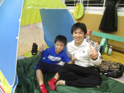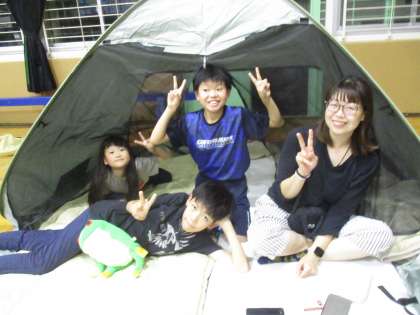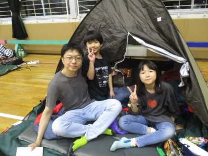 体育館にテントをはっています。
