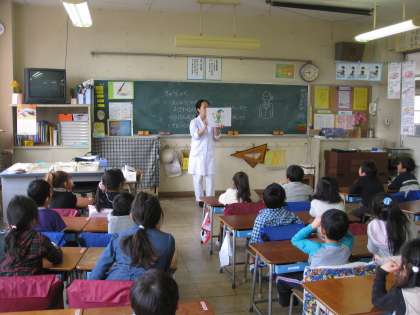 ○栄養士の先生から、給食についてお話をしていただきました。当番の仕方も教えていただいたので、自分の当番の日が楽しみです。
