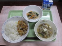 ☆献立☆ごはん厚揚げと豚肉のみそ炒め小松菜とじゃこのおひたしけんちん汁牛乳もった...