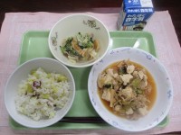 ☆献立☆大山おこわいかの香味炒めきゃべつのしょうが風味じゃが芋のそぼろ煮牛乳大山...