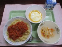 ☆献立☆スパゲティミートソースキャベツとコーンのサラダヨーグルトのパッションフル...
