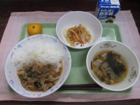 ☆献立☆さつまいもごはんすき焼き風煮物小松菜と油揚げのおひたし牛乳