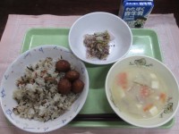 ☆献立☆ひじきごはん揚げボールの照り煮白菜のゆかり和え呉汁牛乳