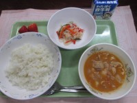 ☆献立☆ガーリックライスチキンのチリトマト煮イタリアンサラダいちご牛乳2月6日よ...