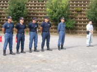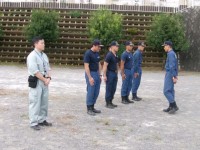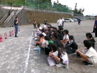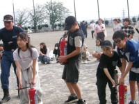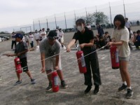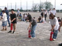 校庭では初期消火訓練を行いました。消火器の使い方を教わりました。