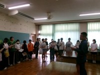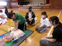 体育館では応急救護訓練を行いました。心臓マッサージとAEDの使い方を訓練しました...