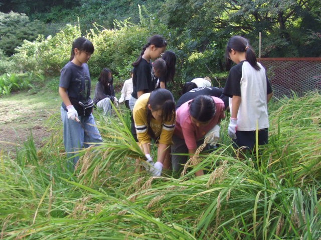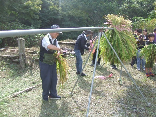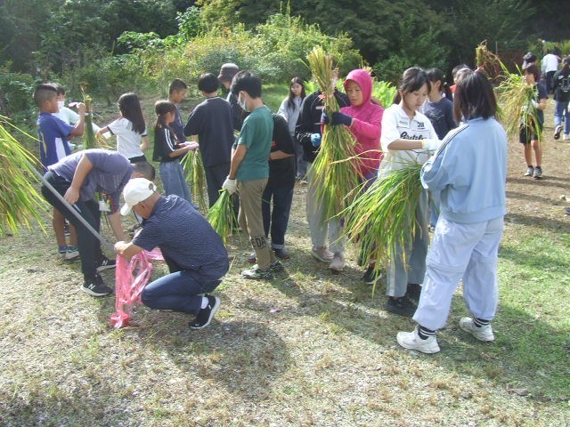 6月に5年生が植えた苗に実がなり、稲穂がこうべをたれてきました。今日は地域の方にも手伝っていただきながら、稲刈りを体験しました。毎年のことではありますが、何回見ても城山小らしいのどかな光景です。しばらく乾かした後、脱穀・籾摺りし、家庭科の調理実習で実食する予定です。