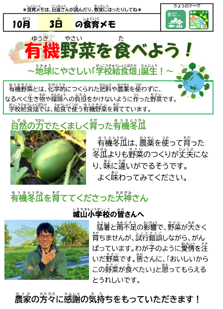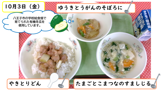 今日は、八王子市の学校給食畑で育てられた「有機冬瓜」を使ったそぼろ煮です。