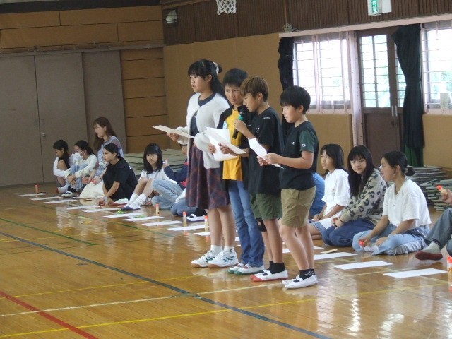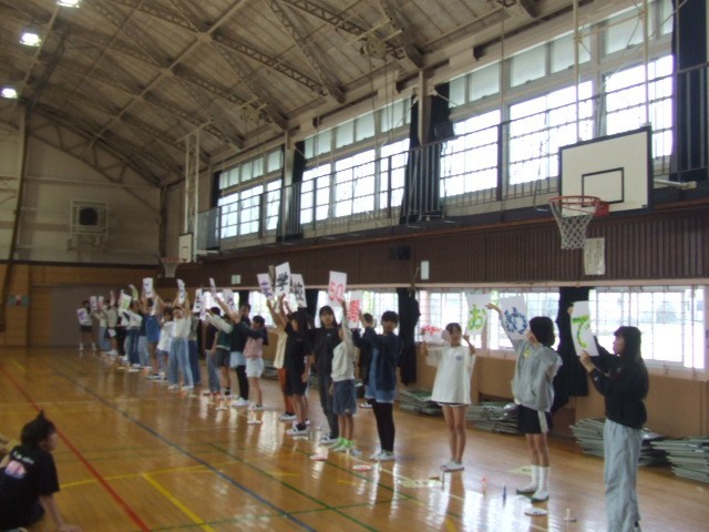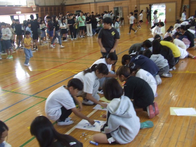 今朝の色別班活動は「創立50周年記念装飾集会」です。来週の50周年式典に向けて、体育館に飾るお祝いメッセージを全校で作ります。色別班ごとに文字が一文字ずつ割り当てられ、細かく切った色紙をリレー形式で貼っていきます。10分もたつと文字ができあがってきました。完成したメッセージが発表され、みんなで拍手喝采です。