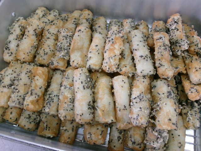 石垣揚げは八王子城の石垣に見立て、ちくわに白と黒のごまをまぶして油で揚げました。