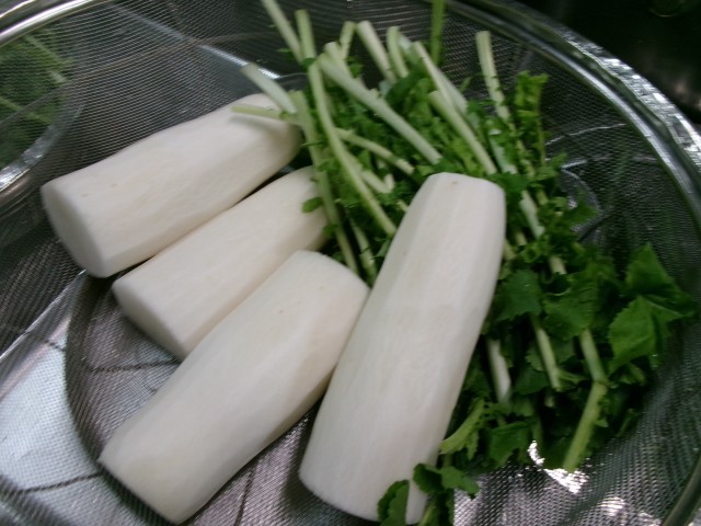 大根、しいたけ、さつまいも、かぶ、小松菜、長ねぎ、チンゲン菜、しょうがを入れて作りました。