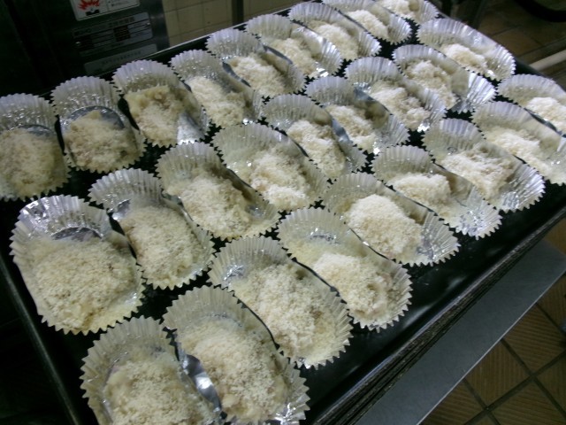 俵型に丸めてカップに入れたらパン粉をかけてオーブンで焼きます。