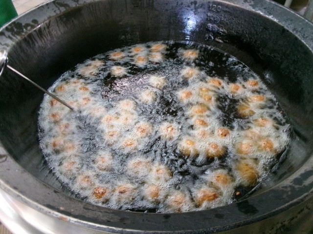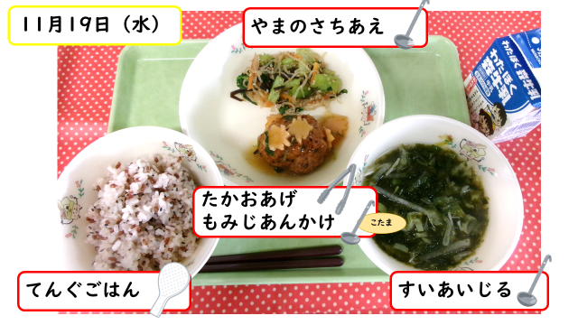 「高尾揚げ もみじあんかけ」は鶏ひき肉に豆腐、ちりめんじゃこ、にんじん、たまねぎ、しいたけを混ぜて丸め、油で揚げました。