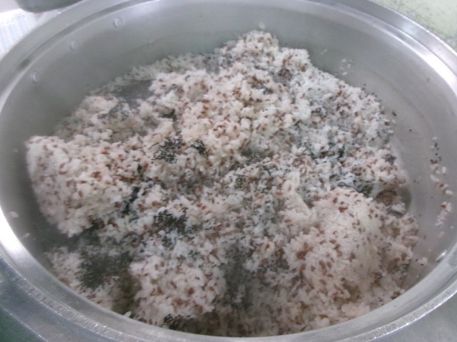 「天狗ごはん」は赤米でごはんに色付けし、天狗の帽子を黒ごまで表しました。