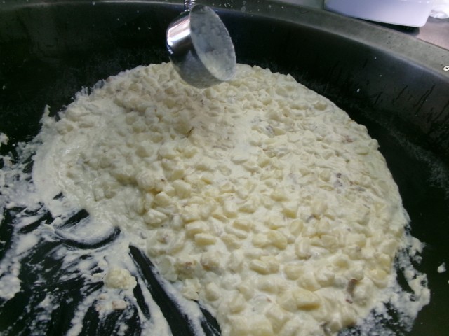 牛乳、チーズ(ピザ用)、生クリーム、塩、こしょうで味付けしたチーズソースを作り、蒸したじゃがいもを入れて完成です。