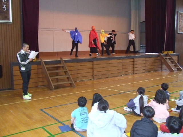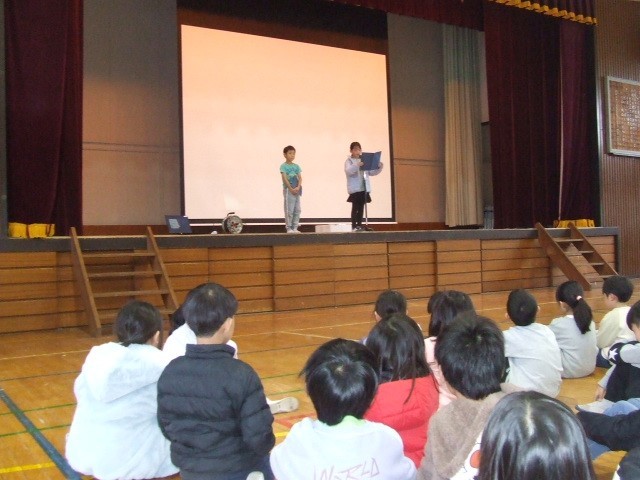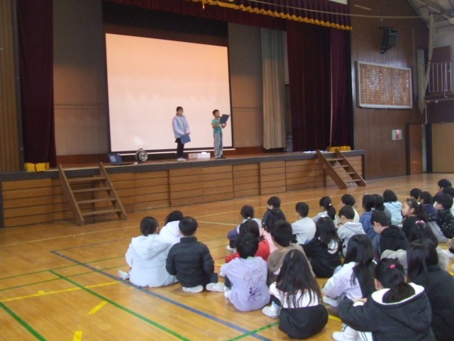 2学期の最終日。4校時は終業式で締めくくりです。児童代表の言葉は3年生が担当し、城山アートフェスティバルを中心に頑張ってきたことを堂々と発表しました。恒例の城山レンジャーも登場し、火遊びの危険性について熱く語ってくれました。安全で楽しい冬休みを過ごしてほしいと思います。