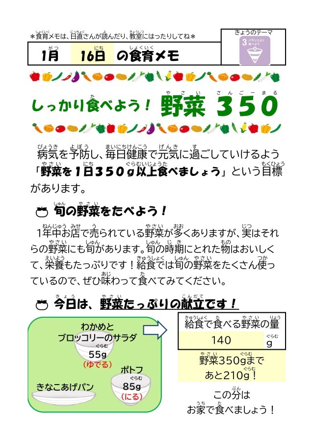 今日の給食は野菜たっぷりのメニューで、約140gの野菜がとれます。