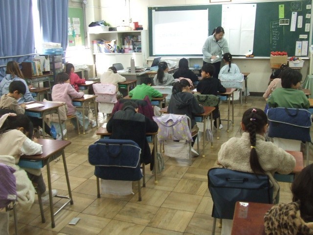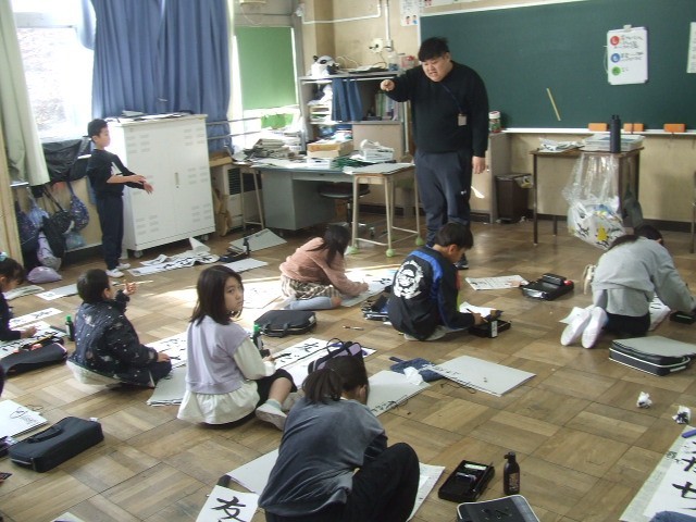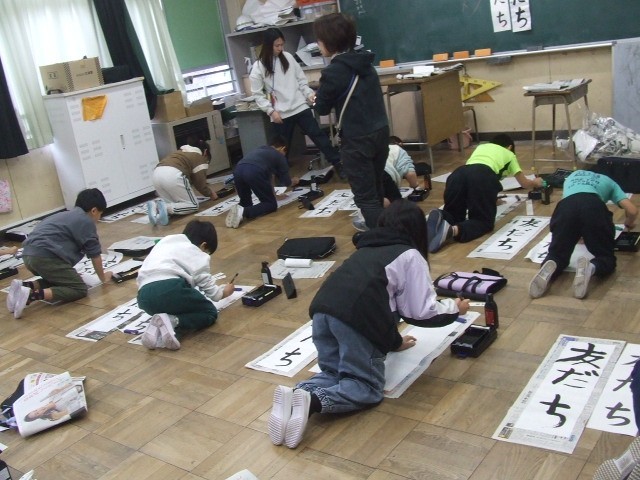 来週から始まる書初め展に向けて、各学年が席書きに取り組んでいます。今日は1年生と3年生が、手本をみながら真剣な表情で鉛筆・筆をはしらせていました。