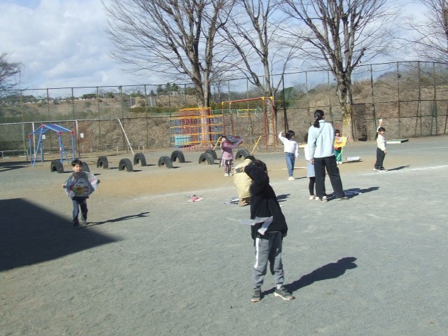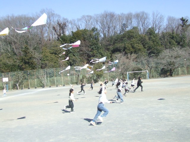 生活科でつくった凧を1年生が揚げていました。町中での凧揚げはほとんど見なくなってしまいましたね。お互いの糸がからんではいけないので、「よーいドン」で同じ方向にダッシュです。1時間たっぷり楽しめました!