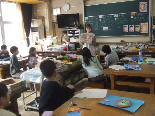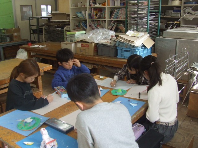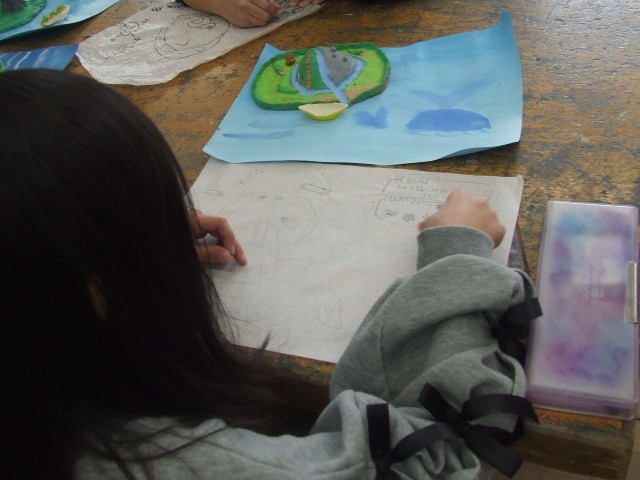 粘土で宝島を作った4年生。それをもとに宝島の地図を描いていました。地図に暗号やクイズを入れながら宝の隠し場所を示します。完成した地図をくしゃくしゃにしたり破れ目をいれたりして、古さも演出していました。この後は互いの作品を鑑賞し合いますが、地図をみながら宝の隠し場所で話が盛り上がりそうです。