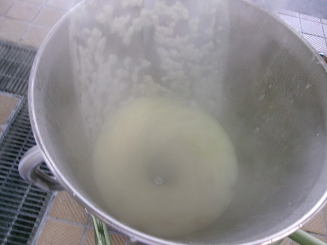 じゃがいものポタージュはたまねぎ、ベーコン、じゃがいもを炒めて、水を加えて煮てからミキサーにかけます。