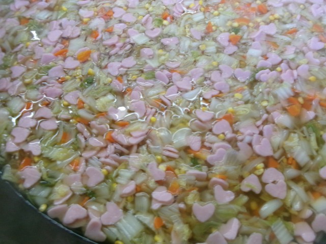 白菜スープの中にはハート型💗のかまぼこを入れました。
