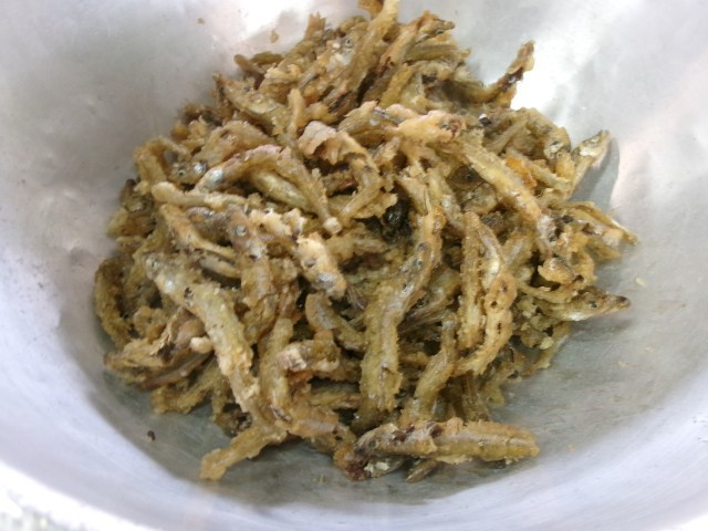 わかさぎに片栗粉をつけて油で揚げて、しょうゆ、砂糖、酢と少し唐辛子を入れたタレにつけて作りました。