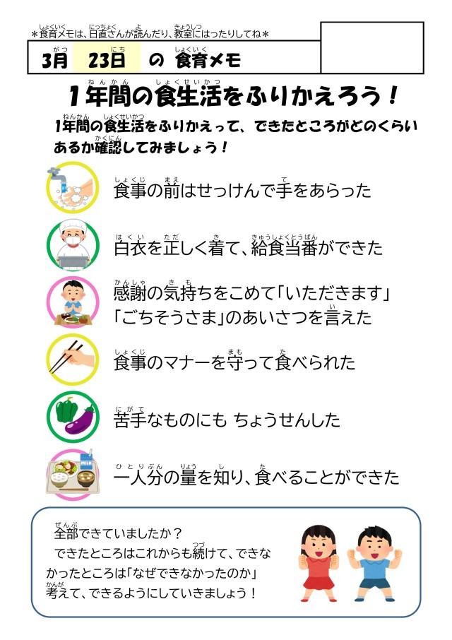 1年生から5年生の皆さんも春休みの間もしっかり食べて元気に新年度を迎えましょう😊