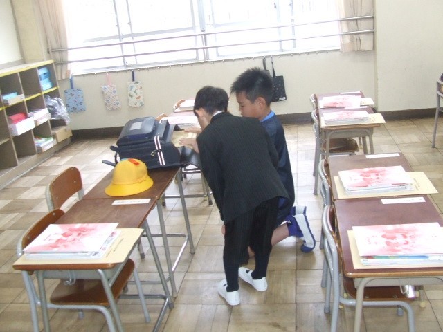 間もな入学式。登校してきた新一年生を6年生が教室まで案内し、ランドセルの片づけを手伝っています。何度も見てきた光景ですが、今年の6年生もとても素敵ですね!