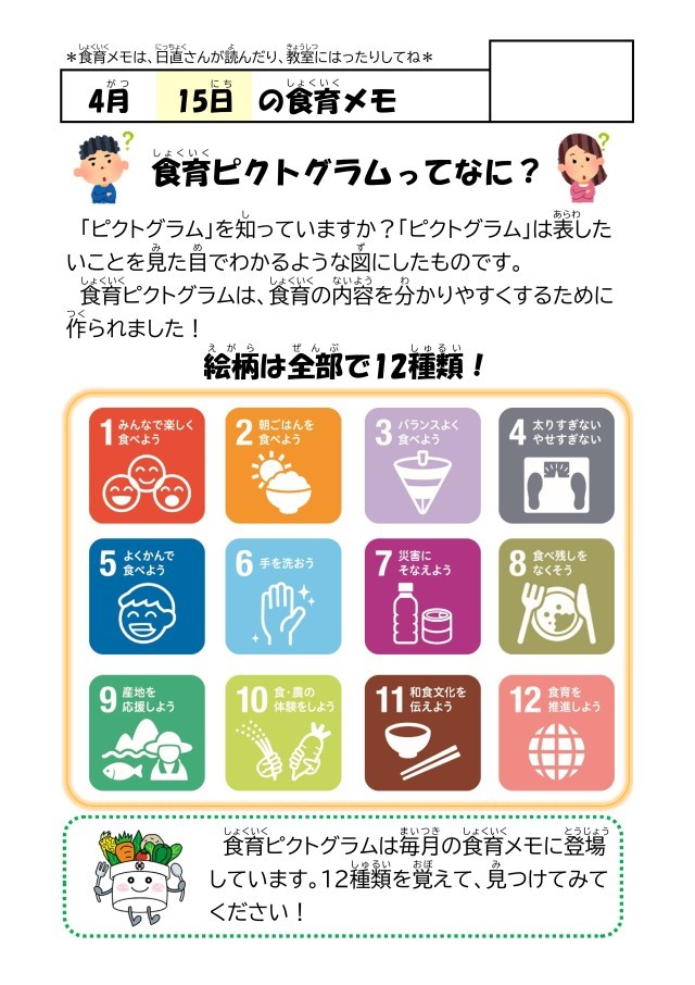 食育メモや食育だよりには内容をわかりやすくするために「食育ピクトグラム」が使われています。