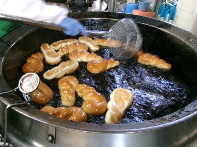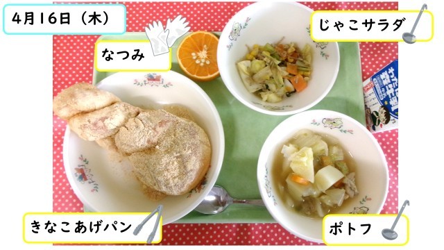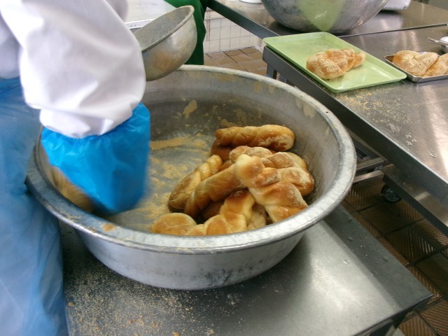 給食室でパンを揚げて、たっぷりのきなこと砂糖をまぶして作りました。
