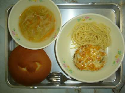 パン 鮭とアスパラのグラタン ぺペロンチーノ せん切り野菜のスープ 牛乳