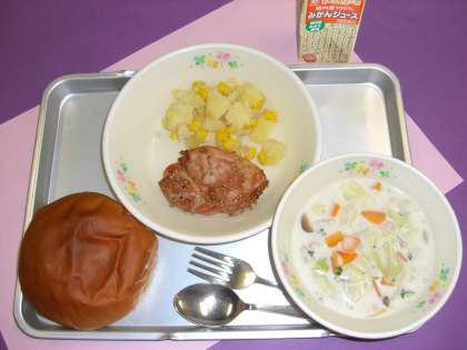 *チャウダーは、アメリカのスープの一つです。クリームなどを入れて煮込んだ具だくさんのスープです。今日は八王子でとれたキャベツ・玉ねぎや、野菜をたっぷり入れて作りました。