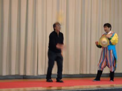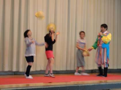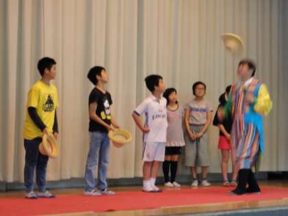 麦わら帽子を使っての演技です。頭上で帽子を回転させ、手を使わずに帽子をかぶる技です。一見簡単そうですが、難しい技です。子どもたちに加えて、先生方も挑戦しました。