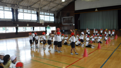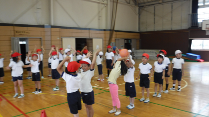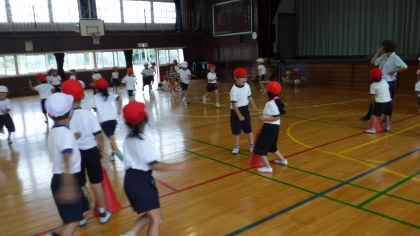 梅雨になり、外で体育が出来ないことも増えてきました。学年で体育館に集まり、学年で体育をしています。「ボール送り」「カモン」をしました。「カモン」とは、じゃんけんで負けてしまった友達のために、みんなで走って助けにいくというものです。みんな友達を助けるため、「疲れた」といいながらも、たくさん走っていました。