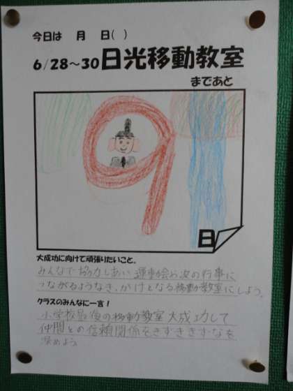 5年生の教室では、稲の発芽の様子を確かめるため、水生栽培をしていました。また、6年生の廊下には、移動教室までの日めくりカレンダーがあり、成功に向けて頑張りたいことなど、決意が書かれていました。