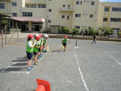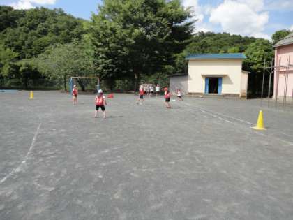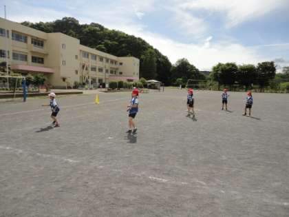 19日は梅雨の晴れ間でした。校庭では4年生がTボールをしていました。