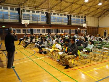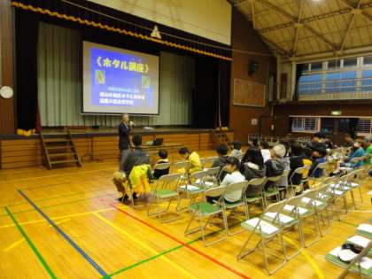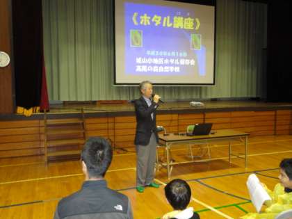 6月16日(土)、サタデースクールで「ホタル観賞会」を行いました。始めに、体育館で城山川の歴史やホタルの生態について話を聞きました。