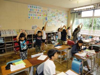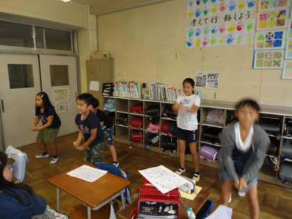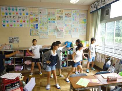 休み時間、4年生の教室をのぞくと、いろいろなクラスの子が混じって、運動会の表現の練習をしていました。がんばってます。
