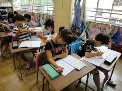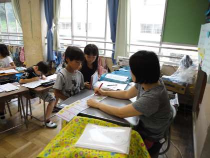 2の1では、国語のテストが終わったところでした。終わった子は漢字ドリルをします。先生に丸をもらい嬉しそうでした。