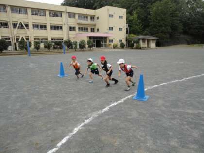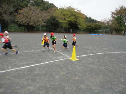 体育のかけっこ、リレーの授業でした。バトンパスの仕方を考えながら、取り組んでいました。