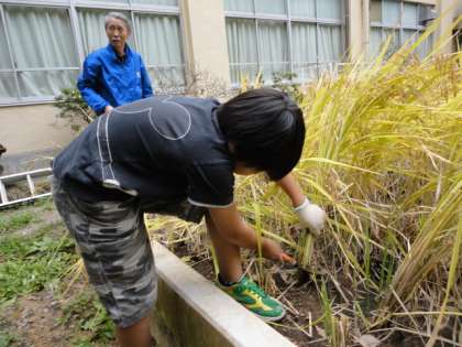 一列ずつ、のこぎり鎌を使って、刈り取っていきます。