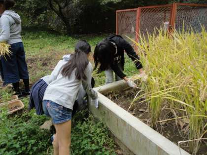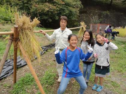 刈り取った稲穂は乾燥させるために、用務主事さんが作ってくれた台に干していきます。
