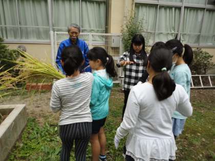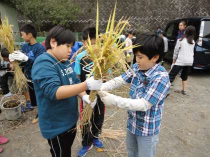 刈り取った稲穂を束ねています。学運協会長も、見に来てくださいました。