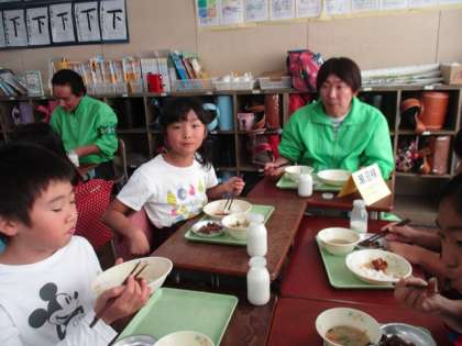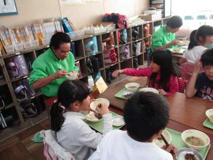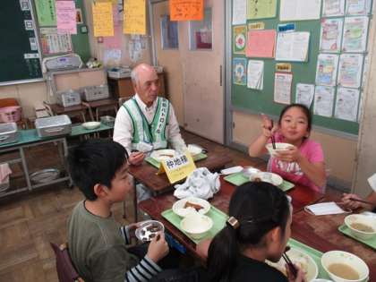 3年生2クラスに、学校安全ボランティアの方々をお招きし、一緒に給食を食べました。