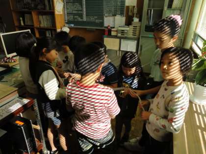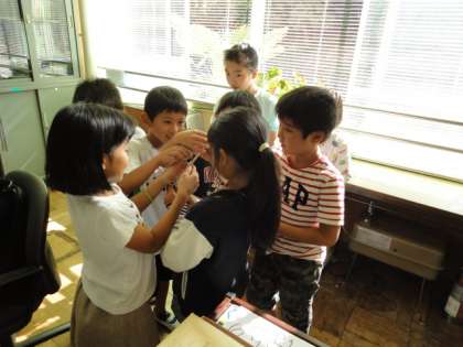 校長室に人だかりができています。お目当ては、1m60cmはある、アオダイショウの抜け殻です。め、しっぽの先と、きれいにそろっています。子どもたちが、その大きさに目を丸くしていました。