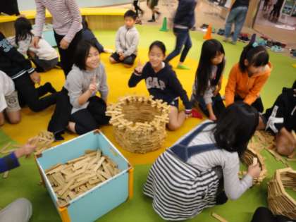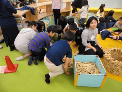 1階のフロアには、木片の積木コーナーがあります。子供たちは、思い思いに形を作りながら、積み上げていました。