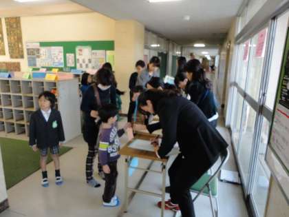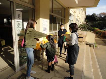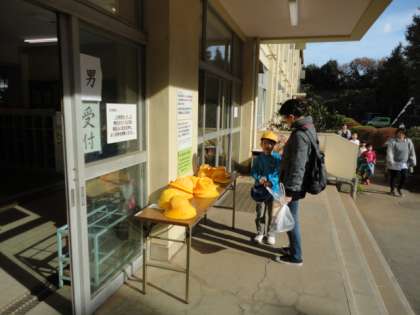 11月16日、就学時健康診断が行われました。受付前に黄色い帽子のサイズを確かめます。4月に待ってますね。