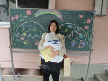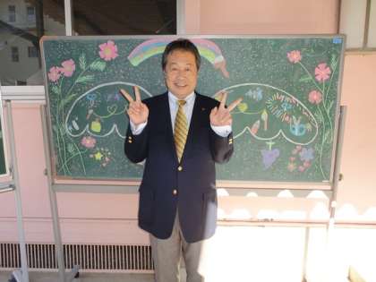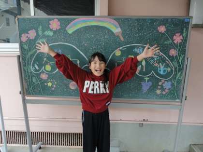 黒板の前に立つと、天使の羽が写る作品もありました。参観に来てくださった安間教育長先生をはじめ、育休中の先生もカメラに収まってくれました。